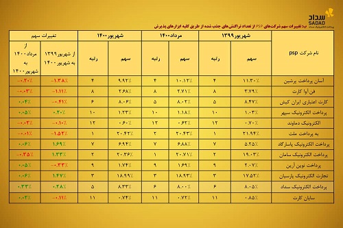 به گفته وی، پرداخت الکترونیک سداد با در اختیار گرفتن سهم ۸/۳۳ درصدی بازار از لحاظ تعداد تراکنشهای جذب شده از طریق تمامی ابزارهای پذیرش، توانست در گروه شرکتهای PSP پس از بهپرداخت ملت، پرداخت الکترونیک سامان، تجارت الکترونیک پارسیان و آسان پرداخت پرشین در پله پنجم جای بگیرد و بدینترتیب جایگاه خود را نسبت به شهریورماه سال گذشته، یک پله ترقی دهد.