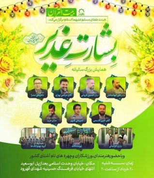 به گزارش ثمره نیوز، محمدرضا عابدی، مدیر بیتالقرآن از برگزاری هجدهمین دوره همایش بزرگ و سالیانه «بشارت غدیر» به همت هیئت طفلان مسلم (ع) خبر داد و گفت: این مراسم باشکوه در آستانه عید سعید غدیرخم و در راستای ترویج فرهنگ ولایت و امامت، روز سهشنبه ۲۰ خردادماه از ساعت ۲۰ برگزار خواهد شد.